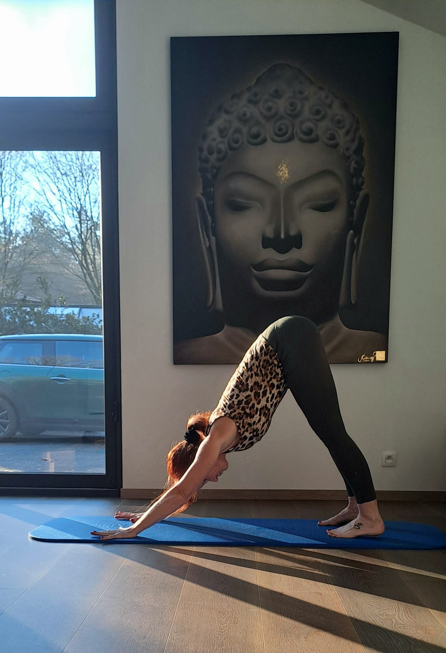 • Statische houdingen, zoals de neerwaarts kijkende hond, die 5 ademhalingen worden aangehouden.